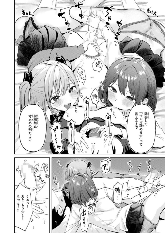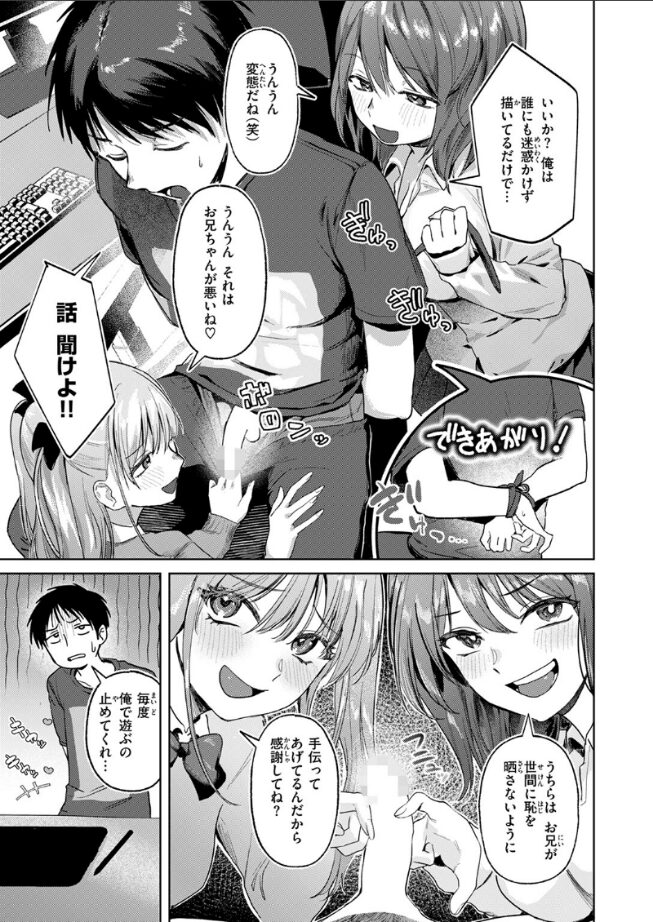 「ちゃんと現実見て 良いコにして 妹で満足してね?」漫画は良い。――なぜなら、どんなデカ乳やエロ女を描いても怒られないから。そんな《理想のエロ》を描く俺のもとに、ナマイキな双子の妹たちが邪魔しに来た。気付けば拘束され、脱がされ……両サイドからのWフェラ。しかも、「もう漫画描くの辞めます」って言うまで射精禁止!?度重なる寸止めプレイ。ち○こが抗えるわけもなく――