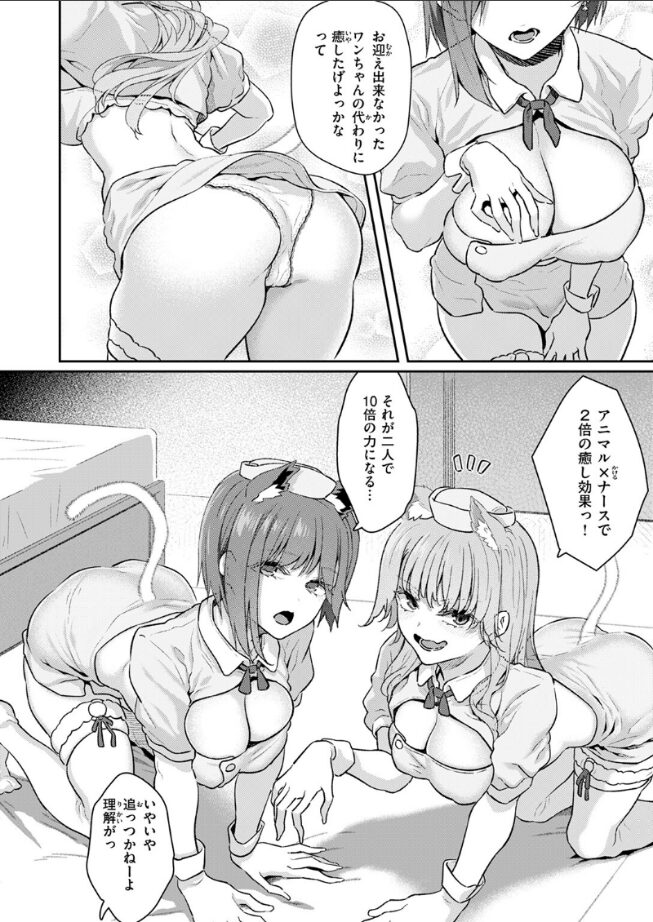 「特別にウチのペットを見せてあげる♪」意気消沈の本城(ほんじょう)くんはかわいい子犬をお迎えするためにバイト代を貯めていたものの、一足遅く他の人に貰われてしまったらしい。用意した資金はなんと50万円。その事を知ったバイト仲間の巨乳ギャル2人・村上(むらかみ)と白川(しらかわ)は、本城くんを癒すための《とある作戦》を思いつき……♪乱交の名手、松河描くケモミミナースなコスエッチ3P♪