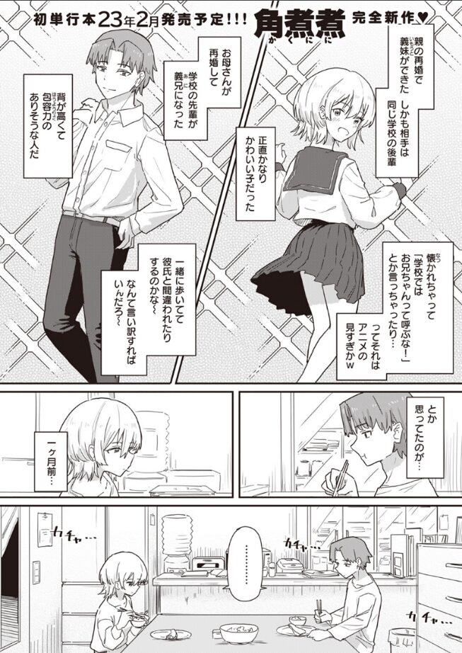 「飲んじゃいました」本当は仲良くなりたかったけどタイミングを逃してしまって、ほぼ会話がない気まずい状態の義兄妹ふたり。双方なんとかしなくちゃいけないと思いつつも解決の糸口が見つからず、会話を振っても3ラリーで終わってしまう日々が続いていた。そんな時TVで≪人の認識を変えてしまう術≫の実演が流れていて――?ほんのちょっと。認識がズレたひとつ屋根の下でのエッチな性活。