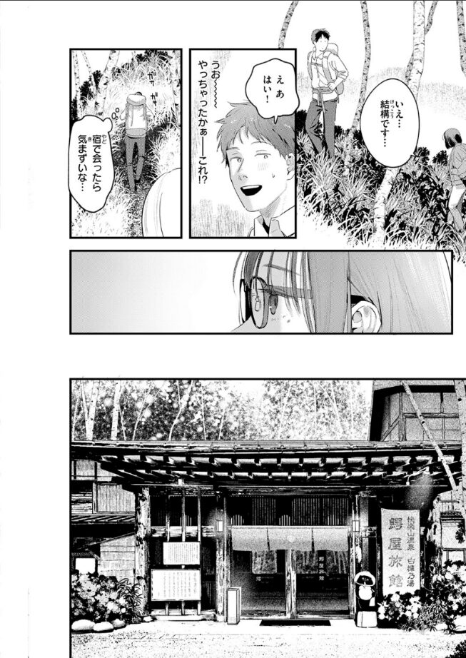 「不倫男にしっかり仕込まれちゃったから…」秘境の旅館へと向かう一人旅、お尻がぷりんとした眼鏡美女に遭遇。人に会うのも珍しい登山道で、目的地は同じ旅館の様子。なんだかヘバっているので同行を申し出たけど、迷惑そうに断られてしまった。やっちゃったかな〜とモヤモヤしながら到着し、露天風呂に行ってみると……湯船にぷかぷかと浮かぶは白いおっぱい。変態だと誹りを受けるも、男女入れ替え制の時間を勘違いしたのは向こうのほう。とはいえ気まずい。もう顔合わせらんない……と思って部屋で籠っていると、地酒を手土産にお詫びのご訪問が。話を聞くと、彼女は傷心旅行らしく、好きな人に奥さんがいたとか。(不倫温泉旅行……エッチじゃん…)なんて感想はしっかり見透かされていて……!?