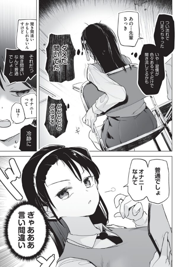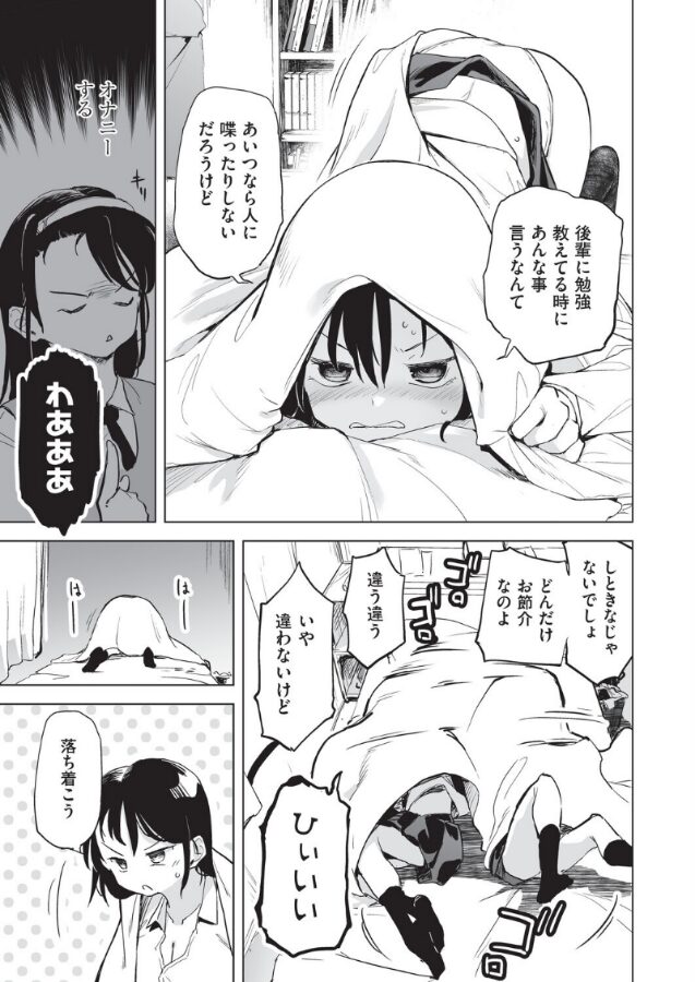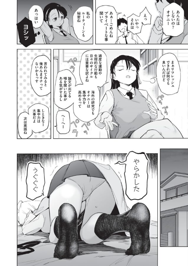 後輩の林道くんに勉強を教える氏家さん。勉強が全然頭に入ってこない林道くんにコツを教えるつもりで毎日の習慣に組み込んで無意識に覚えるようにと自分の例を話したときに、つい日課のオナニーもしゃべってしまう。林道くんにオナニーって?と聞き返されると強がってオナニーなんて普通でしょと正当化してしまう。林道くんにカミングアウトしてから逆に成績を落とした氏家さんは勉強に集中するために一緒に勉強とオナニーをしようと提案し…!?