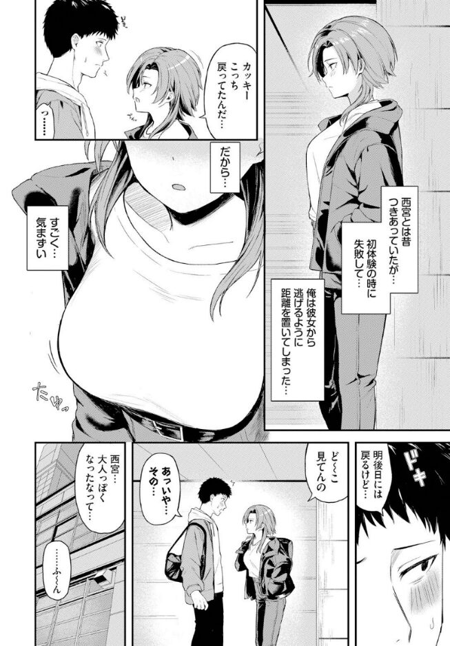 【大人っぽくなった元カノとリトライ初体験っ!】胸キュン求愛マイスター・箱れぇまが贈る、一途な想いが成就するやり直しH♪初体験の時に失敗し、距離を置いてしまった元カノ・西宮と偶然再会した垣原。気まずい空気の中、大人っぽくなった西宮から飲みに誘われる。垣原は過去のことを謝るが、明るい彼女を見るとやり直せたら…と感じていた。別れて以来彼氏ができていないという西宮は、理由があって告白は断っていると意味深な笑みを見せる…。居酒屋を出ると雨が降っていて「雨宿り…する?」と西宮にホテルに誘われて…!?