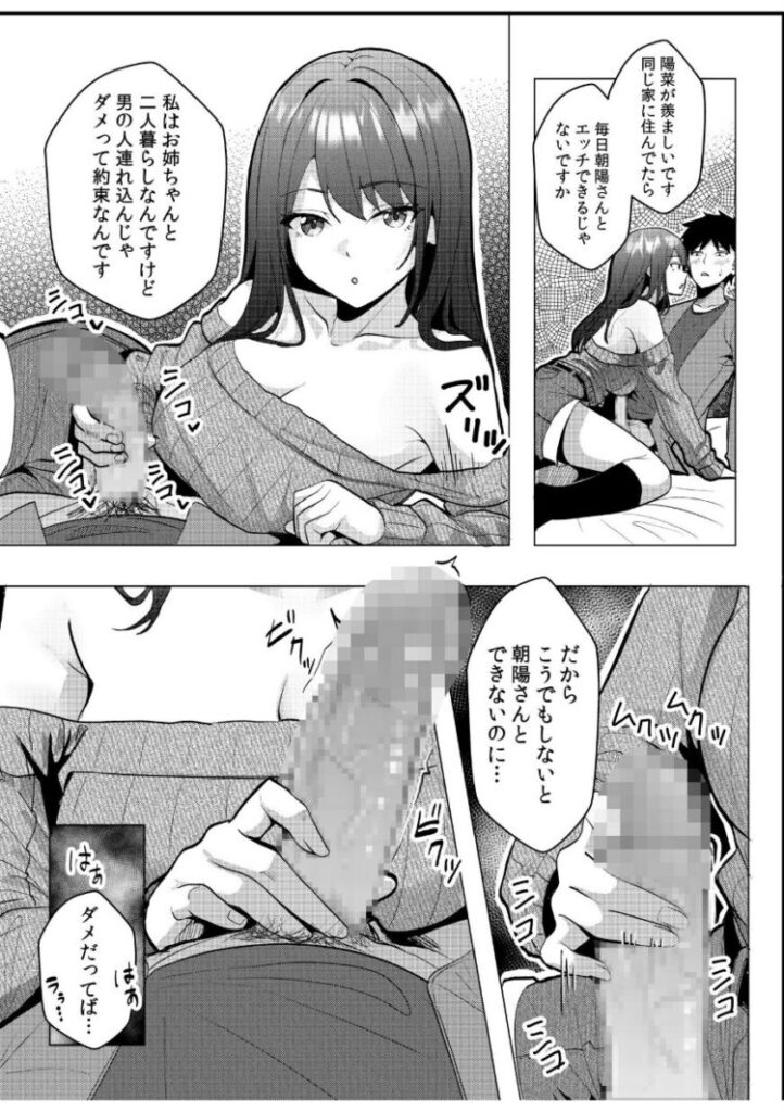 「朝陽さんのこと好きなんです」ホテルに2人きりの状況で美咲にそう告げられた朝陽。陽菜への言い訳を考える予定だったはずが、美咲は強引に朝陽のズボンを下ろし、美咲はまだ勃っていないち●ぽを恍惚とした表情で舐め始める。(陽菜がいるのにこんなのよくないってわかってるけど…)罪悪感と葛藤していると、美咲はハーフパンツから除くむっちりとした太ももで朝陽のち●ぽを扱き始めて…「ダメダメっていいつつ、ここは正直ですね」これ以上はまずいって…!