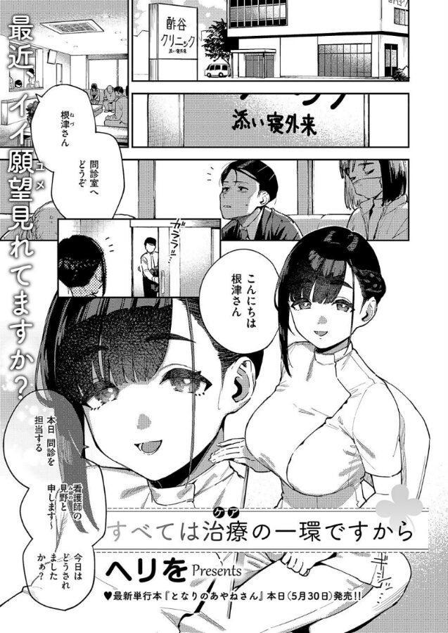 不幸が重なりストレスで夜も眠れなくなった俺は、訪れた添い寝クリニックで美乳の看護師・見野さんとの出会いを果たす。治療を行う母性溢れる見野さんの授乳手コキに、パイズリに、生ま○こに、悩みも精液も吐き出して心身癒やされてーー。最新単行本大好評発売中!エロとエモの俊英・ヘリを先生が描く男の夢が溢れる濃密搾精クリニック♪