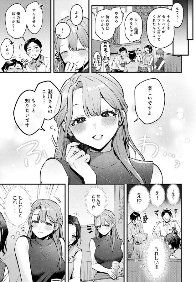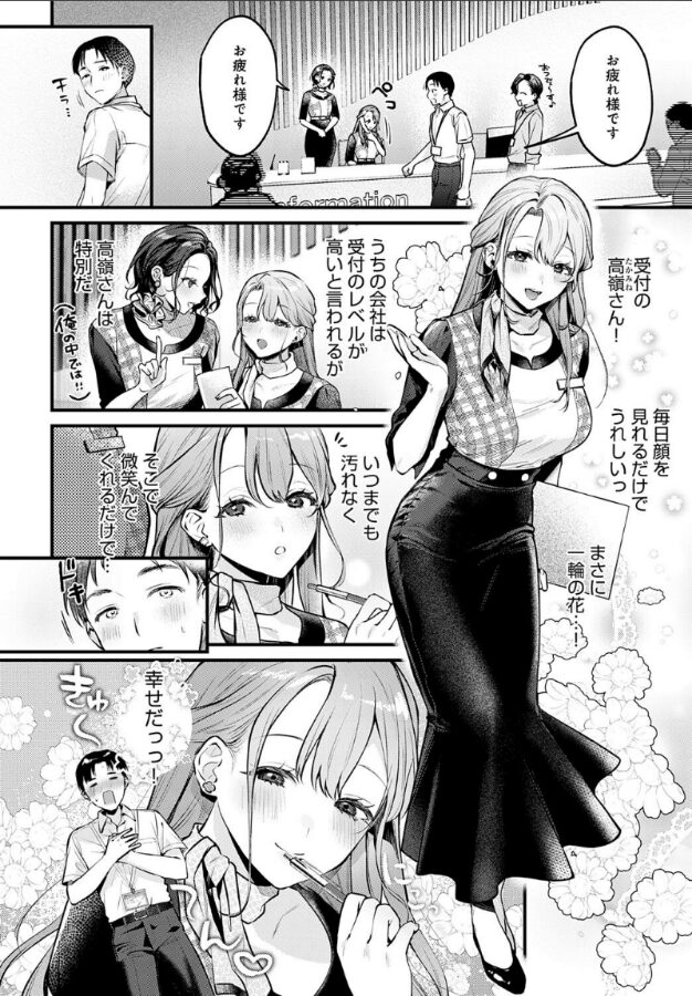 社畜生活3年目。俺は密かに、受付の高嶺さんに恋をしていた──。そんな俺の想いを知る同僚が、高嶺さんを誘って飲み会をセッティングしてくれることに。飲み会で高嶺さんとの距離が一気に縮まり、なんと彼女からホテルに誘ってくれた!?ホテルでは自分がリードしようと意気込む俺。しかし、シャワーを浴びていると高嶺さんが突然乱入! 泡まみれの愛撫にイきそうになって……!!ベッドに移動してからも、高嶺さんに主導権を握られっぱなし。刺激のバリエ豊富な手コキ、奥まで咥え込むフェラチオなど、彼女のテクニックで一方的にイかされてしまう!!気持ちいいけど、俺だって高嶺さんを気持ちよくさせたい!!形勢逆転し、正常位で彼女のイイところを探り──♪超大型新人・みなとく先生熱筆☆ 一見清楚系な肉食美女に責められSEX!!