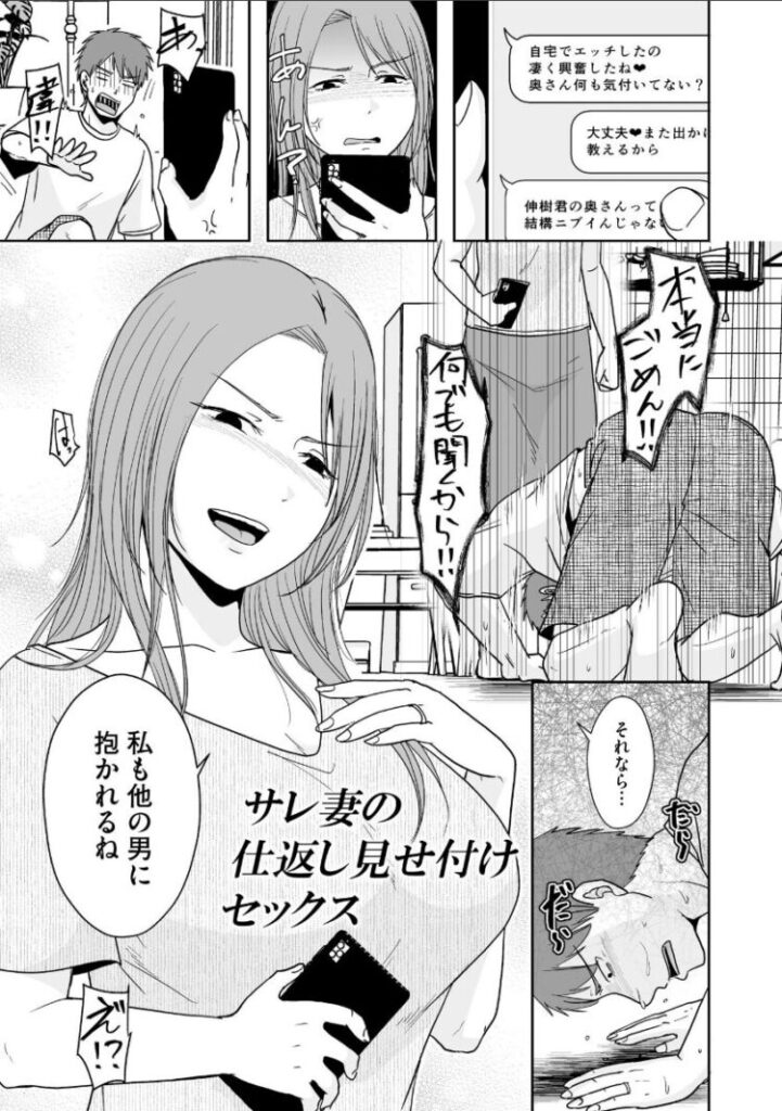 夫の浮気が発覚してなんでも言うことを聞くからと言われたので、復讐として妻も浮気することに。間男を家に連れ込み、逆らえない夫の前で浮気SEX!夫とは出来ないプレイを夫に見せつける背徳感に本気で感じてしまい……。愛する夫以外の男との背徳的なセックスで、堕ちてしまう人妻たち……!!!黒金さつきの描く、人妻ネトラレ短編集がついに単行本化!!※FANZA特典として、描き下ろし漫画8P+商業未発表漫画7Pを掲載!