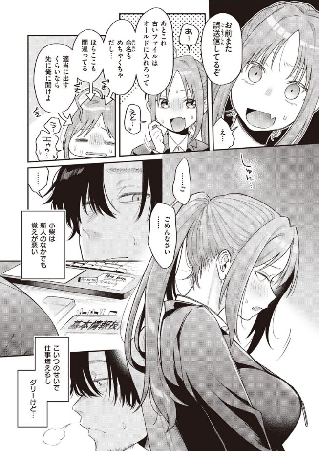 「命令して……いじめてください……♪ いつもみたいにいっぱい怒って……」仕事の覚えは悪く、なにかと手がかかる会社の爆乳新人・小柴(こしば)と、出来の悪い妹のような感覚で面倒を見てあげている先輩。年の差10歳のふたりが出張先のホテルで急接近!?小柴のミスでカップルプランを予約してしまったようで……。